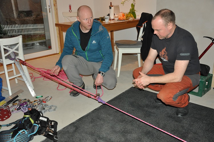 Vi var heldige og hadde med oss breinstruktør Ivar Mjøvik-Hoel som lærte oss kameratredning. Vi hadde en dag med grundig gjennomgang av både teknikk og nødvendig utstyr for vår tur. Det er nemlig ikke all verdens utstyr vi trenger i forhold til å krysse snødekte breer på Svalbard i april. Faktisk langt mindre utstyr enn vi i utgangspunktet hadde sett for oss.