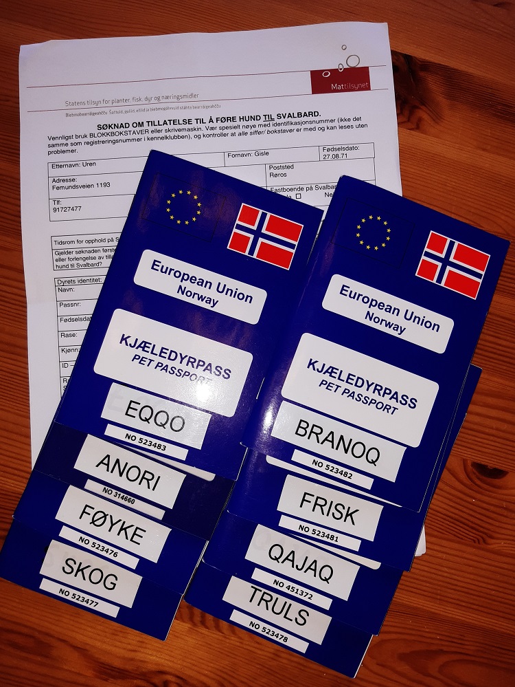 Alle hundene er vaksinert, titrert og godkjent for reise til Svalbard. Oppreisen må som nevnt spres over fire dager, for SAS tillater kun to hunder pr flygning. Vi får dermed begge gleden av å fly til Svalbard to ganger for å komme oss ut på tur.