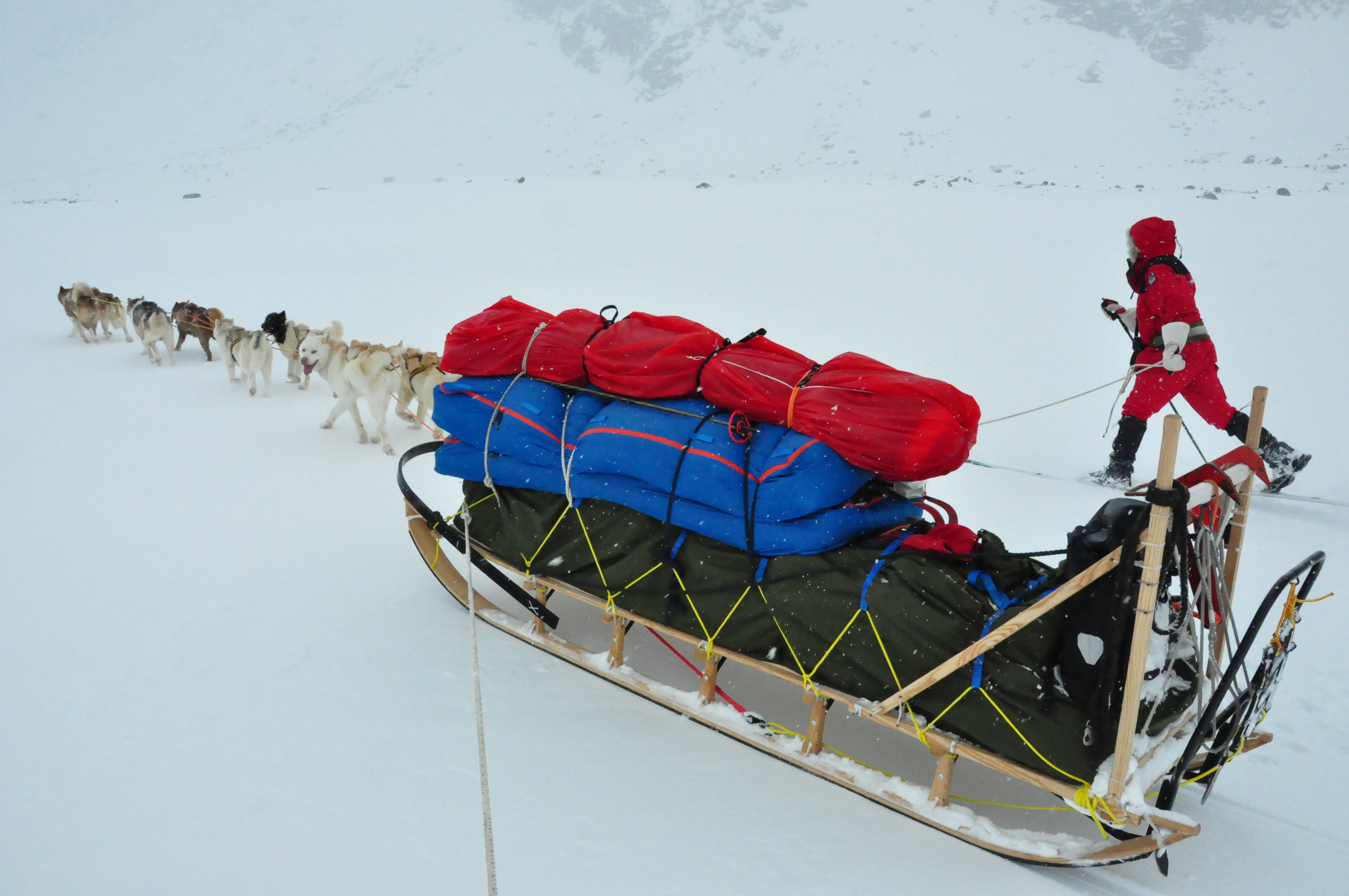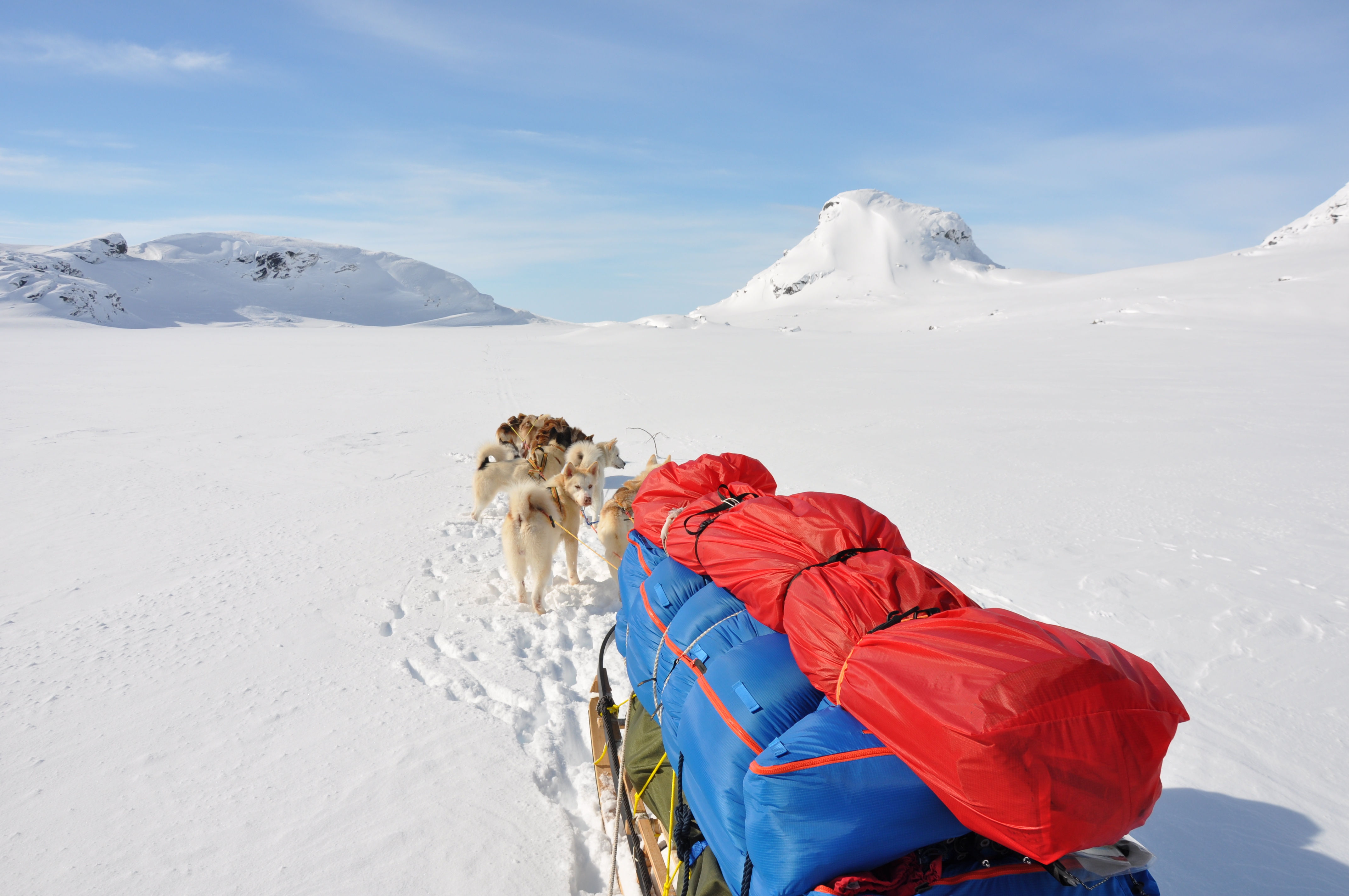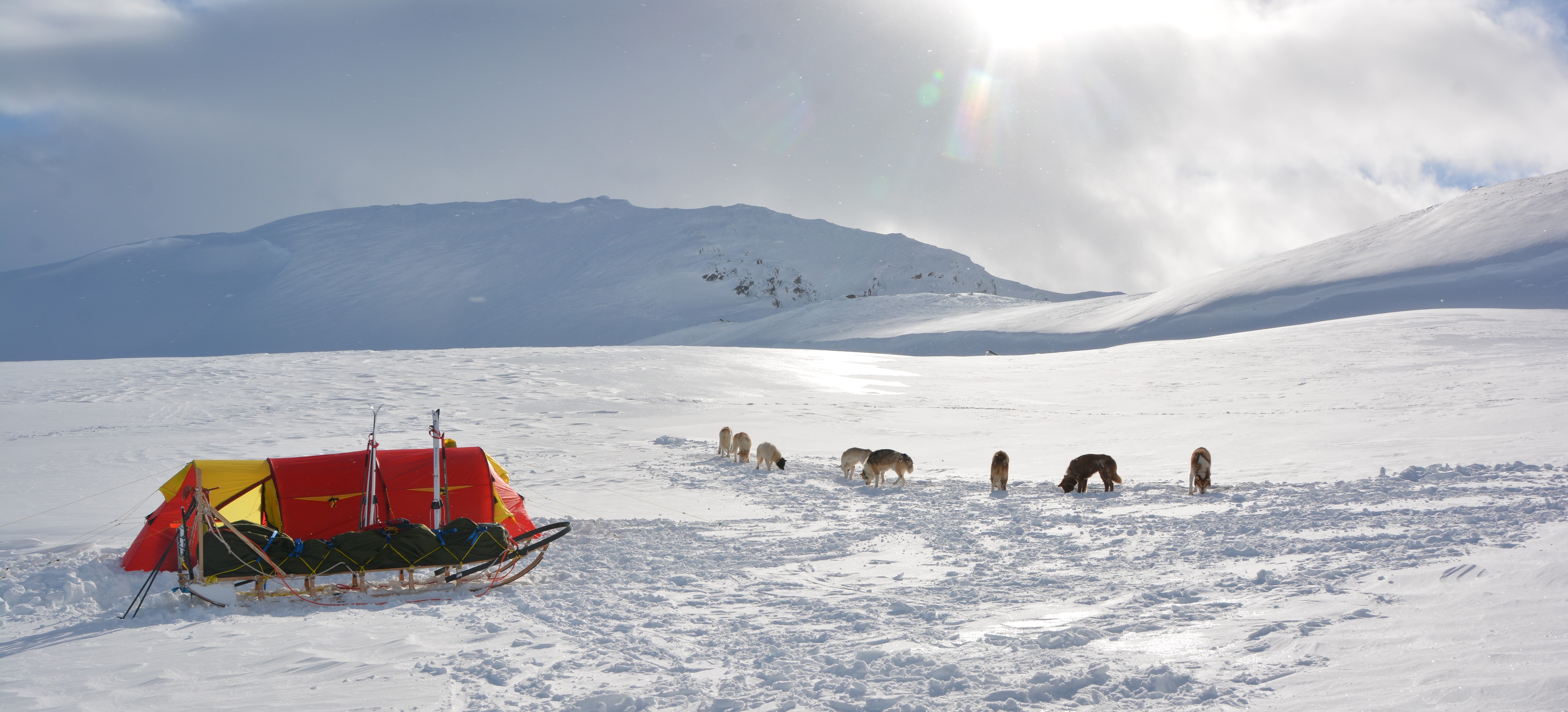 Sleden hadde vi bygget i løpet av høsten og vinteren, og vi følte vi trengte en langtur for å bli kjent med den og å lære å håndtere den i krevende terreng. Sleden har et lasteplan på nesten 3 meter og er over 3,5 meter lang totalt. Selve sleden veier omkring 40 kg, men fullastet med utstyr og proviant for folk og hunder for en drøy uke, er totalvekten fort oppi 200 kg ved start. Dette krever litt av både hundene og hundekjørerne, og turen ga oss mye verdifull erfaring.
