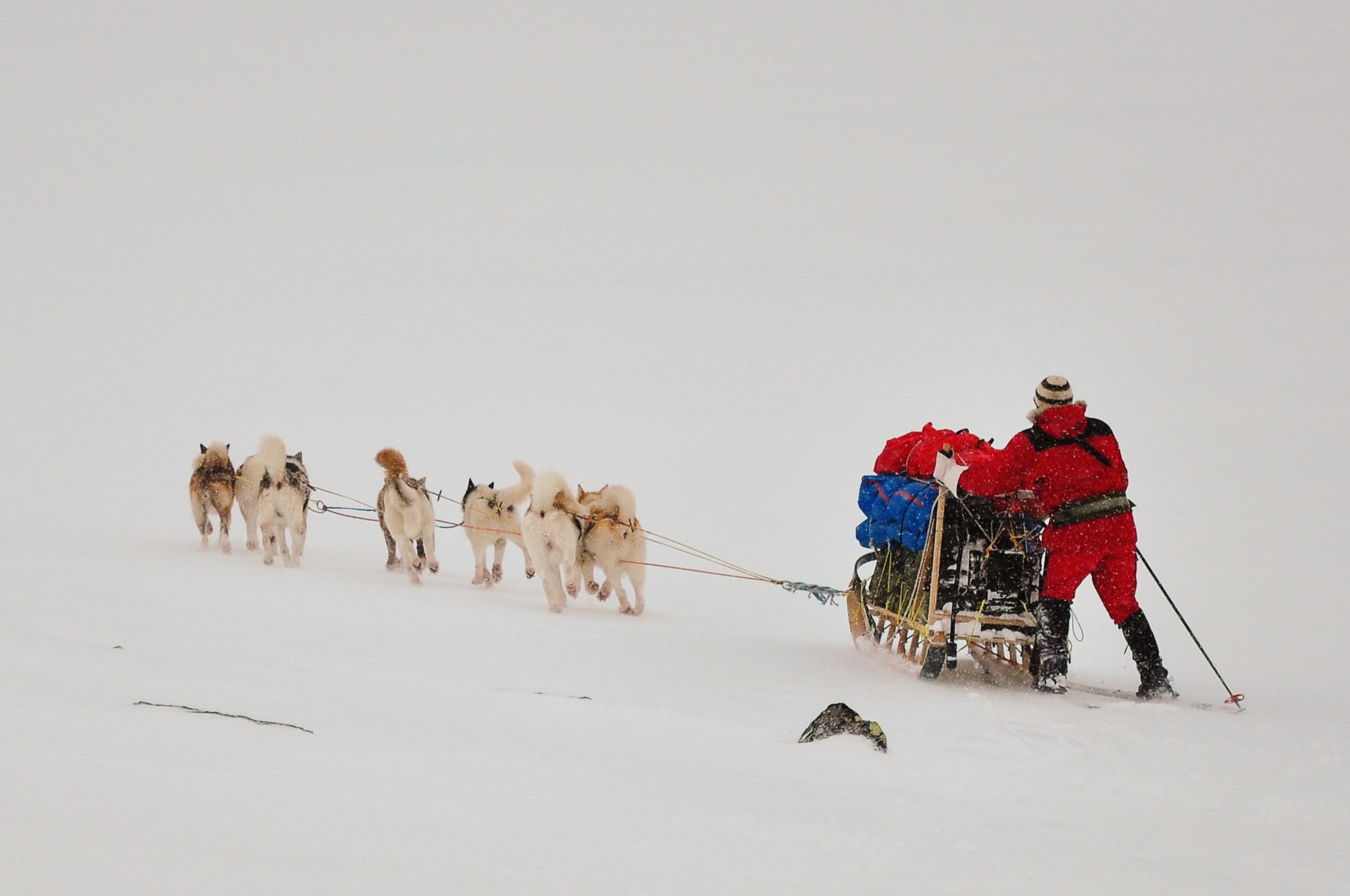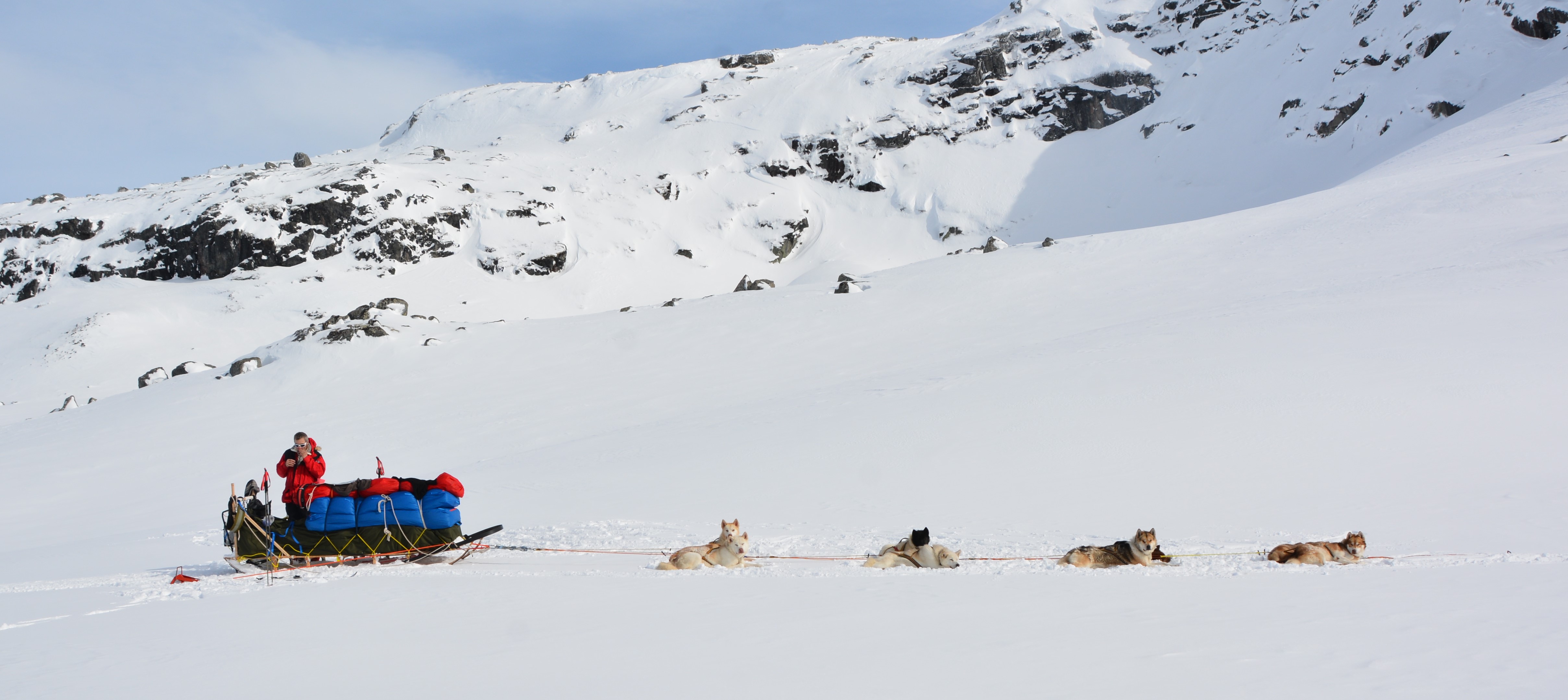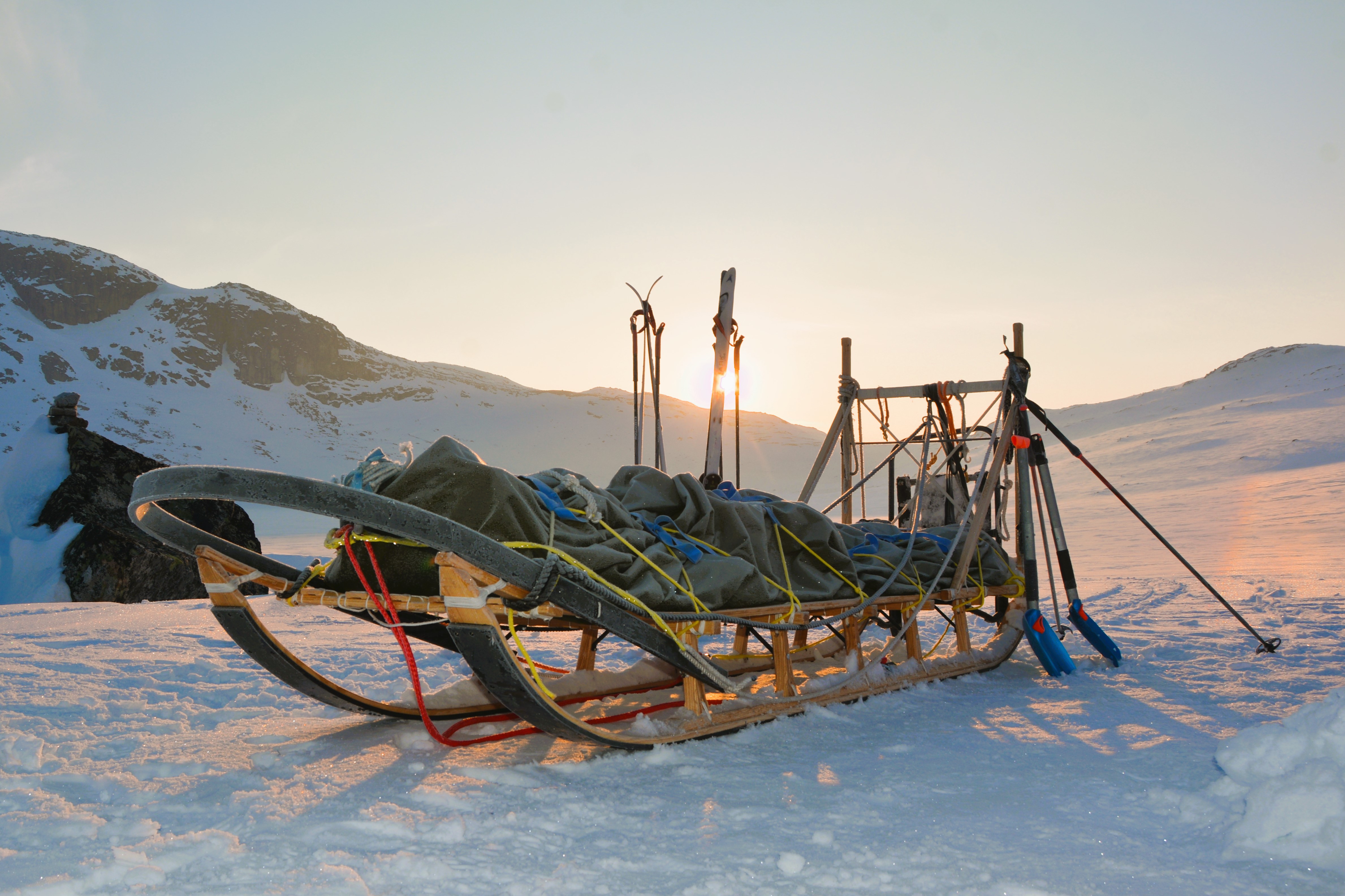 Sleden hadde vi bygget i løpet av høsten og vinteren, og vi følte vi trengte en langtur for å bli kjent med den og å lære å håndtere den i krevende terreng. Sleden har et lasteplan på nesten 3 meter og er over 3,5 meter lang totalt. Selve sleden veier omkring 40 kg, men fullastet med utstyr og proviant for folk og hunder for en drøy uke, er totalvekten fort oppi 200 kg ved start. Dette krever litt av både hundene og hundekjørerne, og turen ga oss mye verdifull erfaring.