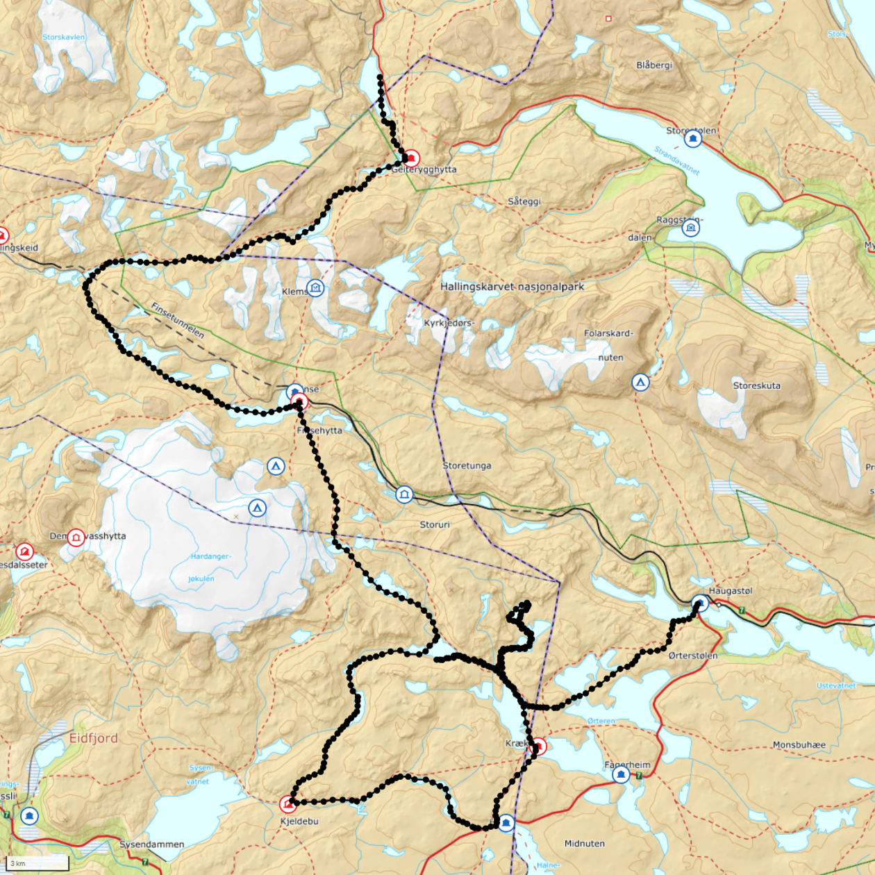 Turen gikk i søre del av Skarvheimen, fra Geiteryggen sør-vestover om Lågheller til Finse. Derfra sørover om Kjeldebu og til Halne, Før vi tok en ny sving opp til Finnsbergvatnet og til slutt til Haugastøl der bil og henger ventet oss.