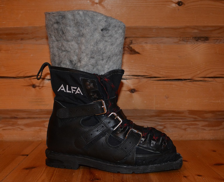Skistøvlene våre er Alfa Polar Advance, en lett skistøvel sydd i Cordura-nylon og kromgarvet lær, på en 75 mm NN Vibram-såle, som passer til skibindingene våre. Denne skistøvelen er utviklet etter samme prinsipp som Roald Amundsens skistøvler brukt til Sydpolen i 1911. Årsaken til dette valget er at Polar Advance både er en varm, lett, bevegelig, og luftig skistøvel for bruk i kombinasjon med løst isolasjonslag inni. Vi bruker ullkartanker i våre støvler. Sammenlignet med en kraftig lærstøvel, er vår støvel rask å tørke når den blir våt, noe som ikke er utenkelig der vi beveger oss på både bre, fjord og fjell. I tillegg er denne støvelen tilpasset bruk med vår type binding.